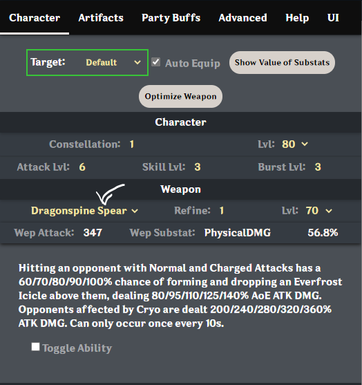 ATK - The sum of all ATK sources. The calculator automatically determines the stats for your items and character based on the levels and settings you choose. Includes artifacts with ATK as main or.